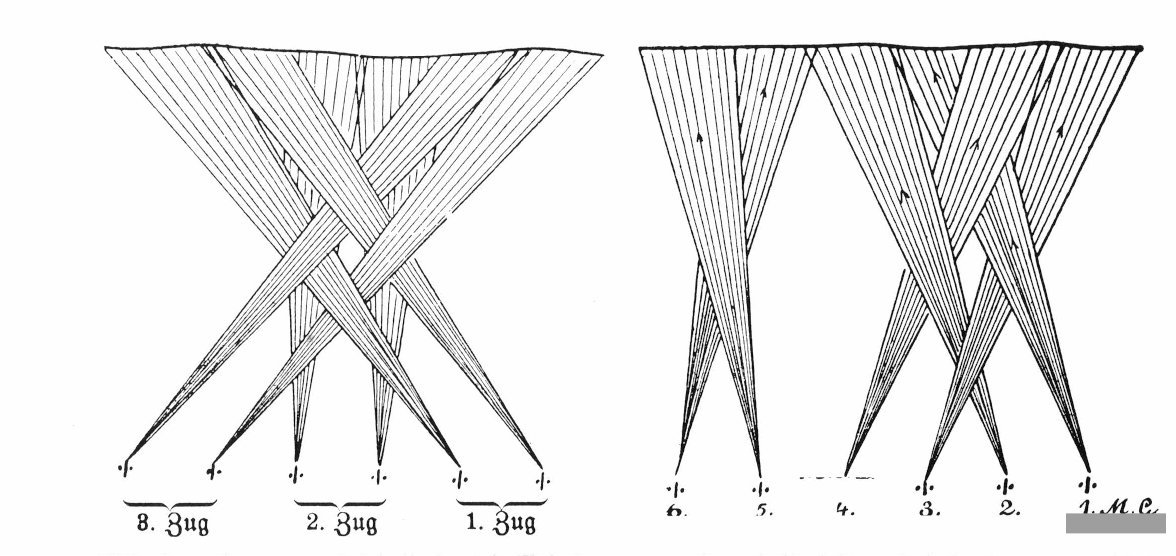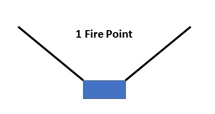 Additional fire points may be accumulated also from the fire of Trench Mortars, Field Artillery, Heavy Artillery, gas, and indirect fire from MG Battalions. The total fire being taken by all bases in a unit is reported using the app when its status is being checked. Fire coming from infantry (including Stosstruppen), MG battalions, cavalry, and tanks is done using the fire arcs shown above. In all such cases, fire does not go through friendly units or blocking terrain. It does go through enemy units, as troops would not be dense enough to stop the effects of this kind of area fire.