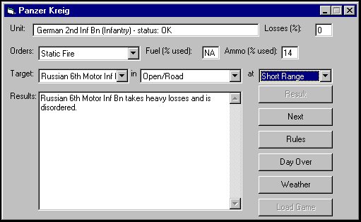 The interface: no typing required! Another thing I hated about the commercial computer-assisted wargames I had seen was that, because they modelled the wargames table inside the machine, a lot of the flexibility that you get by playing minatures rather than computer games wasn't there. The wargaming table could get out of synch with the computer's view of the action, resulting in problems. Further, referees couldn't exercise their role properly, when the rules failed to accurately cover a situation. My third objection - especially with the old DOS-based games - was that the user interfaces were clunky and annoying. With my WWII game, I have managed to avoid these problems. The rules took approximately two man-days of programming in Visual Basic to create, with a few hours (so far) adding features (smoke, air strikes, abandoning vehicles) and fixing bugs. These aren't incredibly hard programs to write! And all you need to do to look up something in the rules is to click on the "Help" button. I think that computer-assisted gaming has many advantages. The time it takes to learn to play is minimal - you need to understand what the game "concept" is (what is represented by a unit, what is the time scale, etc.) and you need to understand what the allowable orders are, but there are no game mechanics to learn. These games can bring us that much closer to a "true" simulation, where a knowledge of the rules is not an advantage, and the focus is on a knowledge of the capabilities of troops, and attention to the flow of battle. Yes, I do sometimes miss rolling handfuls of dice, but I sure don't miss keeping track of all those battle stats, or calculating lists of modifiers. And I love being able to finish a full game early on a Wednesday night... | |||