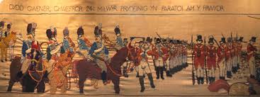 The Directory in France had decided to invade Britain and raise the people against the oppression of King George. They planned to land in Bristol, and make their way from there to Chester and Liverpool. The force was largely composed of convicts released from prison for the task. The landing went badly awry, as such things sometimes do - Bristol proved to be impractical due to the wind, so Cardigan Bay was chosen as a landing site. The invading troops seemed more interested in the contents of a Portugese shipwreck, consisting of food and alcholic beverages, which had been recently liberated by the locals, than they did in spreading Republicanism to the Welsh. A group of the local women, wearing the tall black felt hat and scarlet dress of Welsh traditional costume, had come to witness the fight between the invaders and the militia, but were mistaken by the invaders for "troops of the line to the number of several thousand." No doubt being drunk helped in the inaccurate identification. Into this scene of carnage Jemima Fawr fearlessly waded, pitchfork in hand, and rounded up a dozen of the invaders. She secured them in the parish church before heading out to get some more. (Having once stayed at a hotel in Edinburgh at a time when the Heineken Cup when was being contested by two French rugby teams, I can tell you truthfully that I wouldn't want to try and herd one drunken Frenchman, pitchfork notwithstanding, much less a dozen at a time!) Jemima's bravery is duly recorded - apparently a tradition when the French invade Britain - in its own tapestry, some scenes from which I include below. First, Jemima herself, in action: