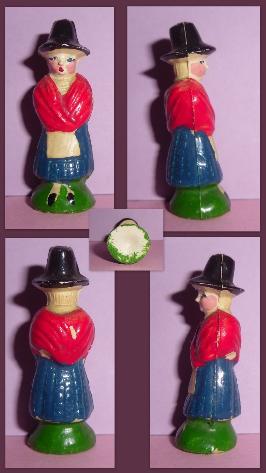 Recreating the contest on the tabletop may not be so easy to do - there are not a lot of depictions of women in Welsh national costume in appropriately-scaled miniature. The closest I could find is shown below, taken from the Small Scale World site. It is in an approximate 54mm scale, an early example of styrene used for making miniatures, and no doubt an expensive collector's item. Given that you'd need a bunch of them, however, using this figure is likely not practical, even if you were willing to game in 54mm. And - if we believe our tapestry - the uniform colours are wrong anyway.