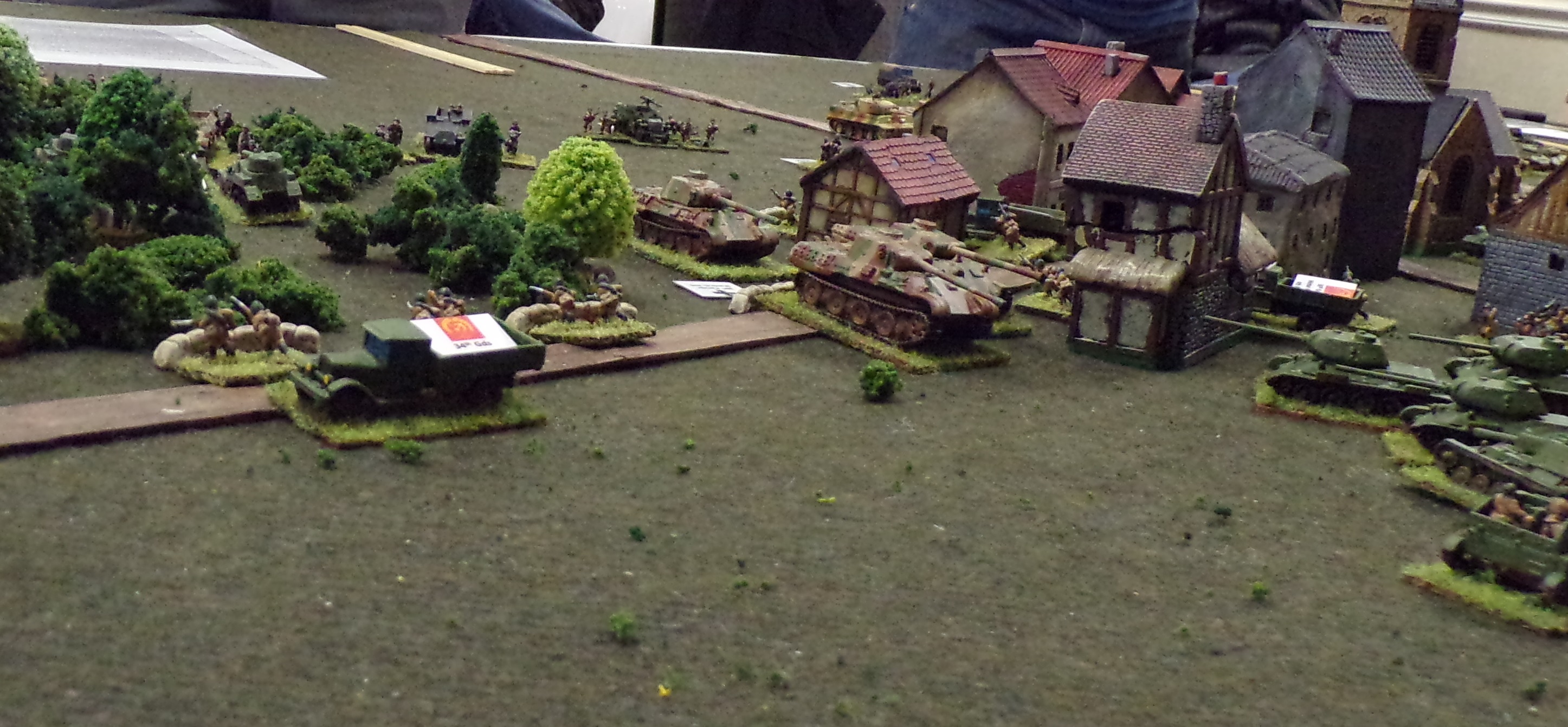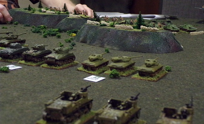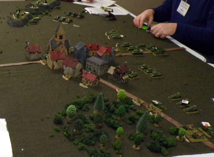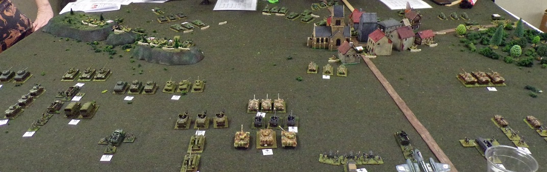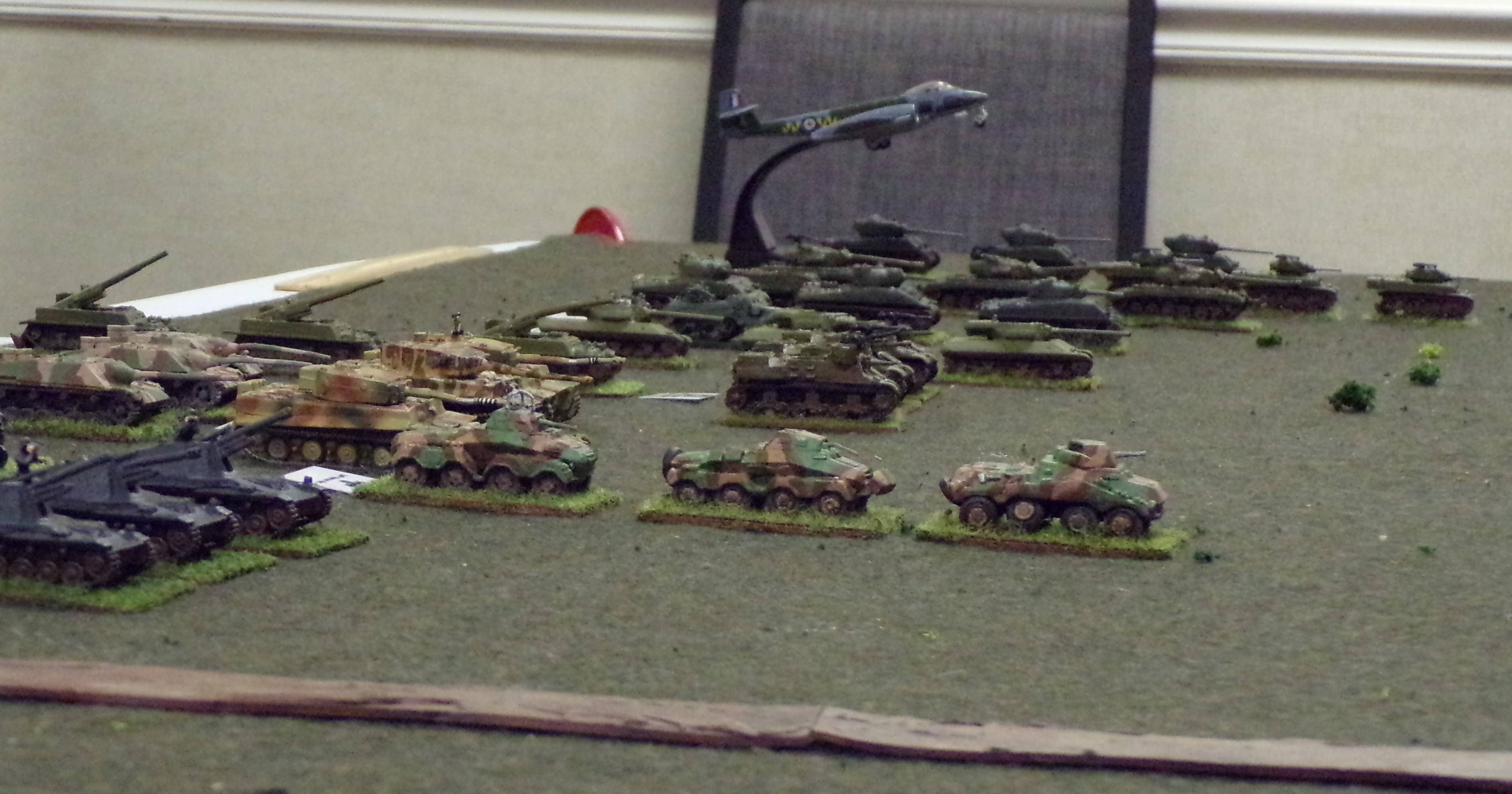Some Like It Hot: Patton vs. the Russians, 1945After-Action Report, Cold Wars 2019, Lancaster Pennsylvania![]() This event was run using Active Armor WWII, a computer-assisted operational-level system, and 15mm (1:100 scale) miniatures. It depicted a fictional surprise attack based on Patton's outspoken advocacy for a strike against the Soviets after the defeat of Nazi Germany in 1945, combined with the first version of Churchill's "Operation Unthinkable," in which 100,000 Germans were to be recruited to help the US and British defeat the Soviets and liberate Poland. Historically, this plan was leaked to Stalin by the Soviet agents who came to be known as "The Cambridge 5," and the Soviets re-deployed their forces in response. So, in our scenario, instead of a thinly-spread Soviet Motor Rifle division, Patton's strike force runs straight into the 12th Guards Tank Corps, dug in and ready for battle. The attack is set on the frontier near to Prague, in Czechoslovakia, at a town called Hradek. Churchill's plan calls for blasting through the front lines, followed by a penetration and then (strategically) a northward sweep to encircle the forward Soviet units and liberate a major portion of Eastern Europe. This game depicts the first day of the attack. (The scenario, charts, and computer set-up files can be found here in the Scenarios section.) The ChallengeThe Soviets, although possessing a powerful force including heavy tanks and self-propelled artillery, do not know where the Allies will strike. They set up first, needing to cover every possible avenue of attack. The Allies set up second, with full knowledge of the Soviet deployments. The Allied victory conditions require the creation of a corridor a foot wide across the table by the end of the day, to establish a path through which the Allied forces can pour for their northward sweep. Although the Soviet air force historically enjoyed superiority in numeric terms, the Allied advantage in strategic bombers has been used (in our scenario) to draw off much of the Soviet air strength. For the purposes of this battle the Allies enjoy a significant advantage in air support. From the Allied perspective, their forces are well-suited to the task at hand. The US 4th Armored Division is a crack formation, the pride of Patton's 3rd Army. The 14th Panzer Division - a surviving undefeated German armored formation, holding out in the Courland Pocket at the end of the war - has been re-constituted with captured German tanks and equipment. All of the troops are highly-motivated veterans. The air support is supplied by the RAF in the form of several squadrons of Gloster Meteors, early jet aircraft with a powerful strike capability. Locally, the Soviet air forces are outnumbered 2-to-1. What was supposed to be a walk in the park has turned out to be much more difficult, however: the Soviets are ready for an attack, and have dug in along the frontier. If the Soviet forces are not tied up along the whole battle line, they will be able to respond to an attack at any single point with overwhelming force. ![]() The tabletop (8' x 5'). The Soviets may deploy along the southern edge of the woods, along the road, anywhere inside of Hradek itself, and along the ridge line running east. The hills are rough terrain. The Allies must advance onto the table from the north. The scenario depicts the first day of the battle, with each turn lasting for an hour. The attack begins at dawn. For this game, the weather was clear, but low-light conditions exist at the start of play. Maneuver units are battalions (3 or 4 bases, each representing a company), with an entire corps on each side. The BattleThe Soviets deployed along the front with dug-in infantry and towed anti-tank guns. Artillery and armored reserves were located centrally, positioned to respond to the Allied schwerpunkt. In the center, to the east of Hradek, an inviting gap is left open, surrounded on three sides. The Soviets set up a killing zone in case the Allies should do the obvious thing. Needless to say, they were not so obliging. ![]() The Soviet deployment: anti-tank guns and infantry dug in across the front, backed up by armor and artillery. The Allies began their advance with armored units: the Germans were on the western side of the front, up to the center, and the Americans to the east. A battalion of Tigers led a tentative push towards the central pocket in the Soviet lines, with recon units advancing toward the near edge of Hradek. A battalion of Panthers pushed for the gap between the town and the wood. The main Allied thrust seemed to be American, aimed at the ridge line at the eastern edge of the table, however, and the Soviet armored reserve started to shift toward it in response. ![]() The Americans begin their advance towards the ridge line, supported by German artillery units as well as their own. The Allies did not use any of their air power during the low-light conditions of dawn, but once the sun was fully up the Meteors of RAF 613 and 614 Squadrons went into action, destroying a regiment of SU-76s and reducing a unit of SU-122s to a shadow of their former selves. ![]() A regiment of SU-122s is effectively removed from play by Gloster Meteors. It soon became clear that the American advance in the east would not be the only matter of concern to the Soviets, however. Some of the T-34/85s had to be pulled back to deal with the lead tanks of 14th Panzer to the west of Hradek. ![]() View of the table from the north as the battle develops. It became clear that a major battle for the position on the ridge would take place. The American tanks were not necessarily the best units for this assault, but were pushed forward regardless, with the bulk of the US armored infantry deployed in support. ![]() Soviet troops dug into the ridge line, as seen by the troops of the 4th Armored Division. At this point, the Soviets chose to hit some of the important attacking formations with their available airpower. Bo