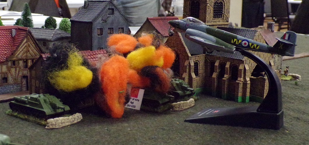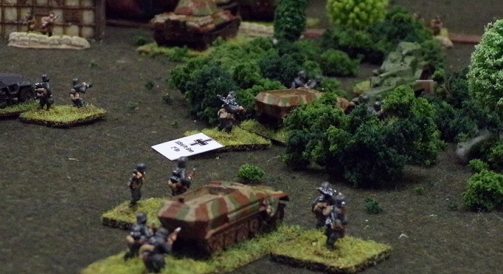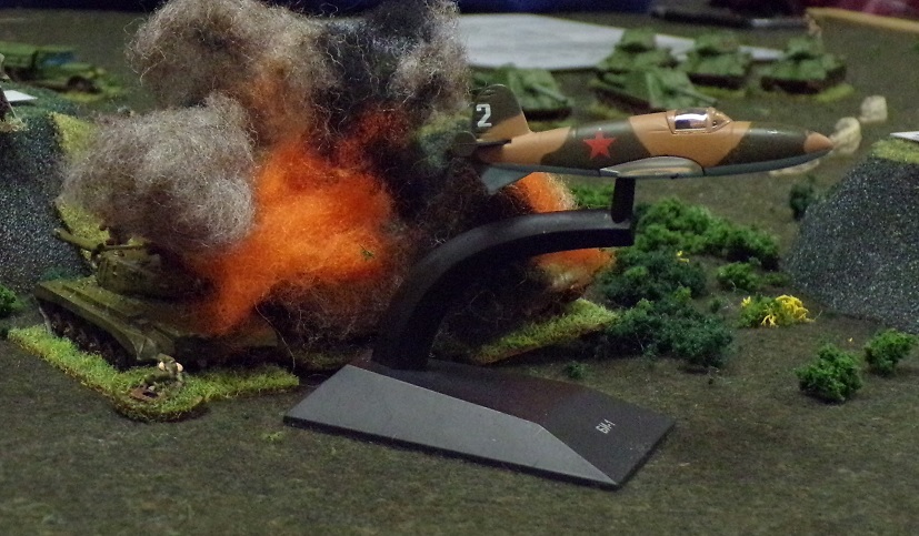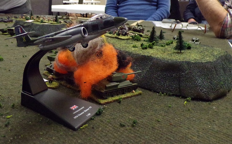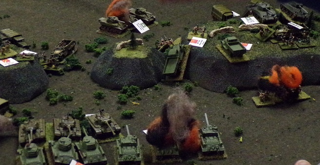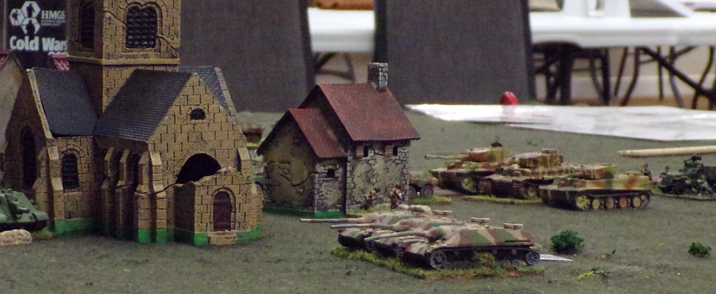 Some Like It Hot: Patton vs. the Russians, 1945After-Action Report, Cold Wars 2019, Lancaster Pennsylvania![]() This event was run using Active Armor WWII, a computer-assisted operational-level system, and 15mm (1:100 scale) miniatures. It depicted a fictional surprise attack based on Patton's outspoken advocacy for a strike against the Soviets after the defeat of Nazi Germany in 1945, combined with the first version of Churchill's "Operation Unthinkable," in which 100,000 Germans were to be recruited to help the US and British defeat the Soviets and liberate Poland. Historically, this plan was leaked to Stalin by the Soviet agents who came to be known as "The Cambridge 5," and the Soviets re-deployed their forces in response. So, in our scenario, instead of a thinly-spread Soviet Motor Rifle division, Patton's strike force runs straight into the 12th Guards Tank Corps, dug in and ready for battle. The attack is set on the frontier near to Prague, in Czechoslovakia, at a town called Hradek. Churchill's plan calls for blasting through the front lines, followed by a penetration and then (strategically) a northward sweep to encircle the forward Soviet units and liberate a major portion of Eastern Europe. This game depicts the first day of the attack. (The scenario, charts, and computer set-up files can be found here in the Scenarios section.) The ChallengeThe Soviets, although possessing a powerful force including heavy tanks and self-propelled artillery, do not know where the Allies will strike. They set up first, needing to cover every possible avenue of attack. The Allies set up second, with full knowledge of the Soviet deployments. The Allied victory conditions require the creation of a corridor a foot wide across the table by the end of the day, to establish a path through which the Allied forces can pour for their northward sweep. Although the Soviet air force historically enjoyed superiority in numeric terms, the Allied advantage in strategic bombers has been used (in our scenario) to draw off much of the Soviet air strength. For the purposes of this battle the Allies enjoy a significant advantage in air support. From the Allied perspective, their forces are well-suited to the task at hand. The US 4th Armored Division is a crack formation, the pride of Patton's 3rd Army. The 14th Panzer Division - a surviving undefeated German armored formation, holding out in the Courland Pocket at the end of the war - has been re-constituted with captured German tanks and equipment. All of the troops are highly-motivated veterans. The air support is supplied by the RAF in the form of several squadrons of Gloster Meteors, early jet aircraft with a powerful strike capability. Locally, the Soviet air forces are outnumbered 2-to-1. What was supposed to be a walk in the park has turned out to be much more difficult, however: the Soviets are ready for an attack, and have dug in along the frontier. If the Soviet forces are not tied up along the whole battle line, they will be able to respond to an attack at any single point with overwhelming force. ![]() The tabletop (8' x 5'). The Soviets may deploy along the southern edge of the woods, along the road, anywhere inside of Hradek itself, and along the ridge line running east. The hills are rough terrain. The Allies must advance onto the table from the north. The scenario depicts the first day of the battle, with each turn lasting for an hour. The attack begins at dawn. For this game, the weather was clear, but low-light conditions exist at the start of play. Maneuver units are battalions (3 or 4 bases, each representing a company), with an entire corps on each side. The BattleThe Soviets deployed along the front with dug-in infantry and towed anti-tank guns. Artillery and armored reserves were located centrally, positioned to respond to the Allied schwerpunkt. In the center, to the east of Hradek, an inviting gap is left open, surrounded on three sides. The Soviets set up a killing zone in case the Allies should do the obvious thing. Needless to say, they were not so obliging. ![]() The Soviet deployment: anti-tank guns and infantry dug in across the front, backed up by armor and artillery. The Allies began their advance with armored units: the Germans were on the western side of the front, up to the center, and the Americans to the east. A battalion of Tigers led a tentative push towards the central pocket in the Soviet lines, with recon units advancing toward the near edge of Hradek. A battalion of Panthers pushed for the gap between the town and the wood. The main Allied thrust seemed to be American, aimed at the ridge line at the eastern edge of the table, however, and the Soviet armored reserve started to shift toward it in response. ![]() The Americans begin their advance towards the ridge line, supported by German artillery units as well as their own. The Allies did not use any of their air power during the low-light conditions of dawn, but once the sun was fully up the Meteors of RAF 613 and 614 Squadrons went into action, destroying a regiment of SU-76s and reducing a unit of SU-122s to a shadow of their former selves. ![]() A regiment of SU-122s is effectively removed from play by Gloster Meteors. It soon became clear that the American advance in the east would not be the only matter of concern to the Soviets, however. Some of the T-34/85s had to be pulled back to deal with the lead tanks of 14th Panzer to the west of Hradek. ![]() View of the table from the north as the battle develops. It became clear that a major battle for the position on the ridge would take place. The American tanks were not necessarily the best units for this assault, but were pushed forward regardless, with the bulk of the US armored infantry deployed in support. ![]() Soviet troops dug into the ridge line, as seen by the troops of the 4th Armored Division. At this point, the Soviets chose to hit some of the important attacking formations with their available airpower. Bo